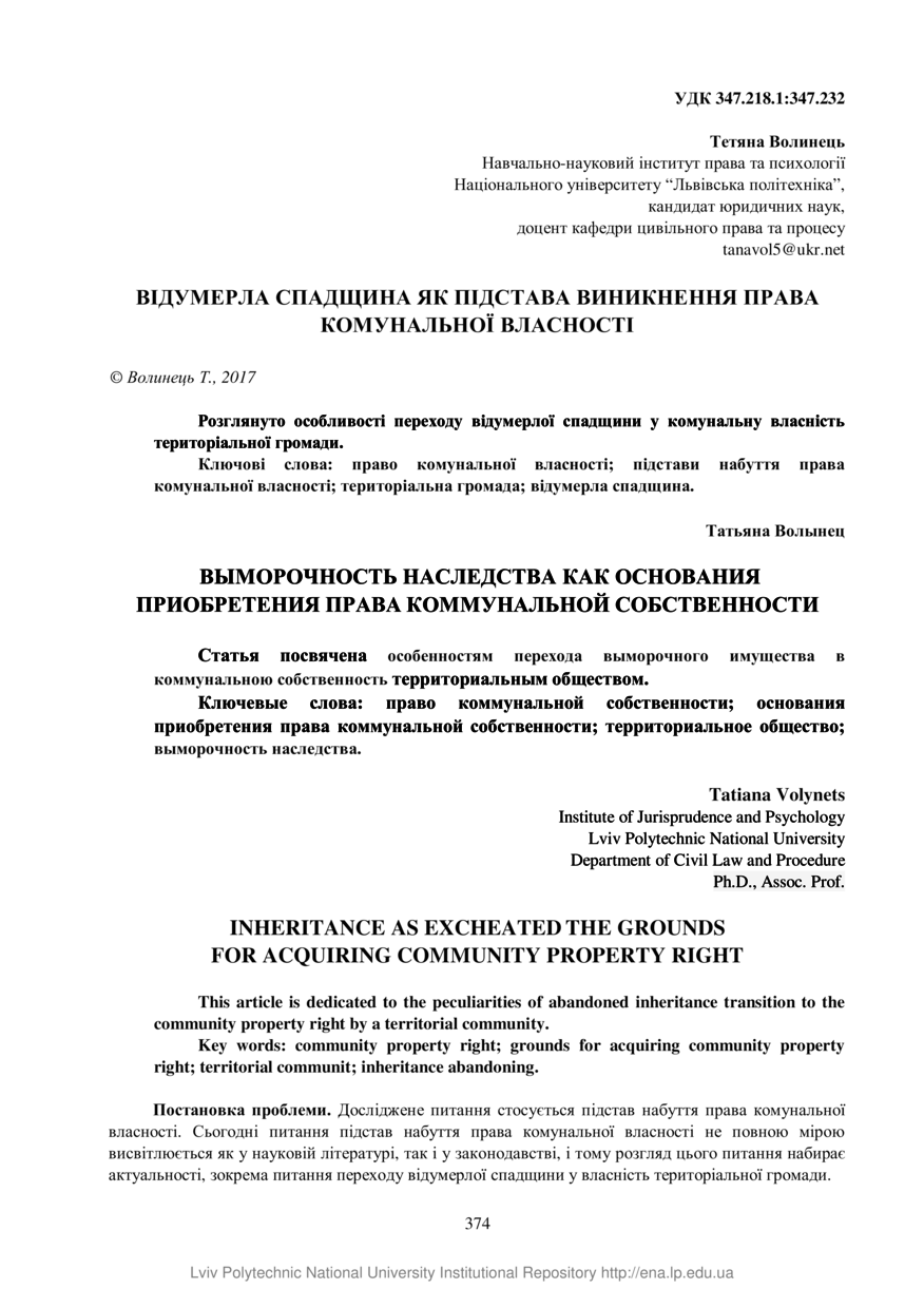 | dc.relation.referencesen | 4. Soltys N. B. Nabuttya terytorialnoyu gromadoyu prava vlasnosti na zhytlo, vyznane vidumerlym [Acquisition by territorial society of right of ownership on the accommodation confessed] K., Redakciya zhurn., 2013. Р. 235–254. | |