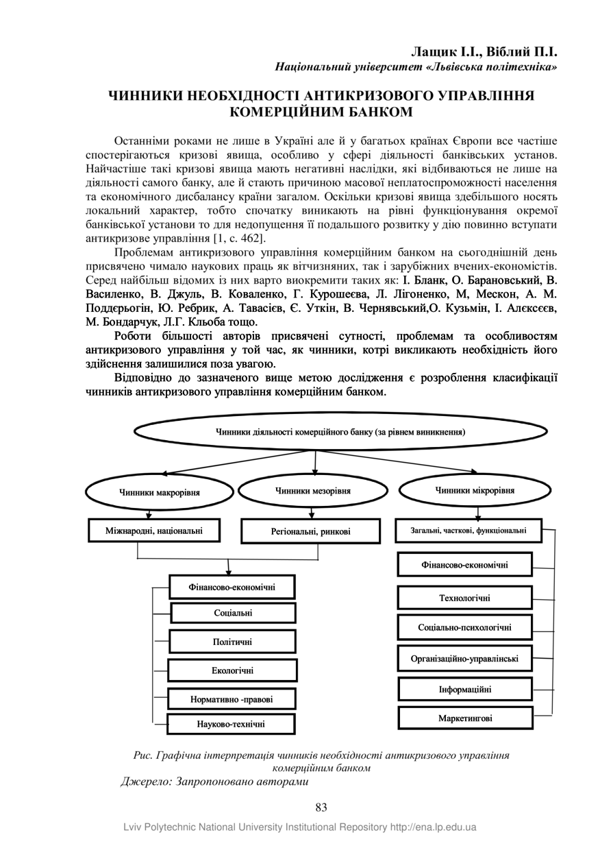 Лащик І. І. Чинники необхідності антикризового управління комерційним банком / І. І. Лащик, П. І. Віблий // Проблеми та перспективи розвитку економіки і підприємництва та комп’ютерних технологій в Україні : збірник тез доповідей ХIV Науково-практичної конференції, 17-20 квітня 2018 року. — Львів : Видавництво Львівської політехніки, 2018. — С. 83–84. — (Розвиток фінансів, обліку та аналізу в умовах глобалізаційних трансформацій).