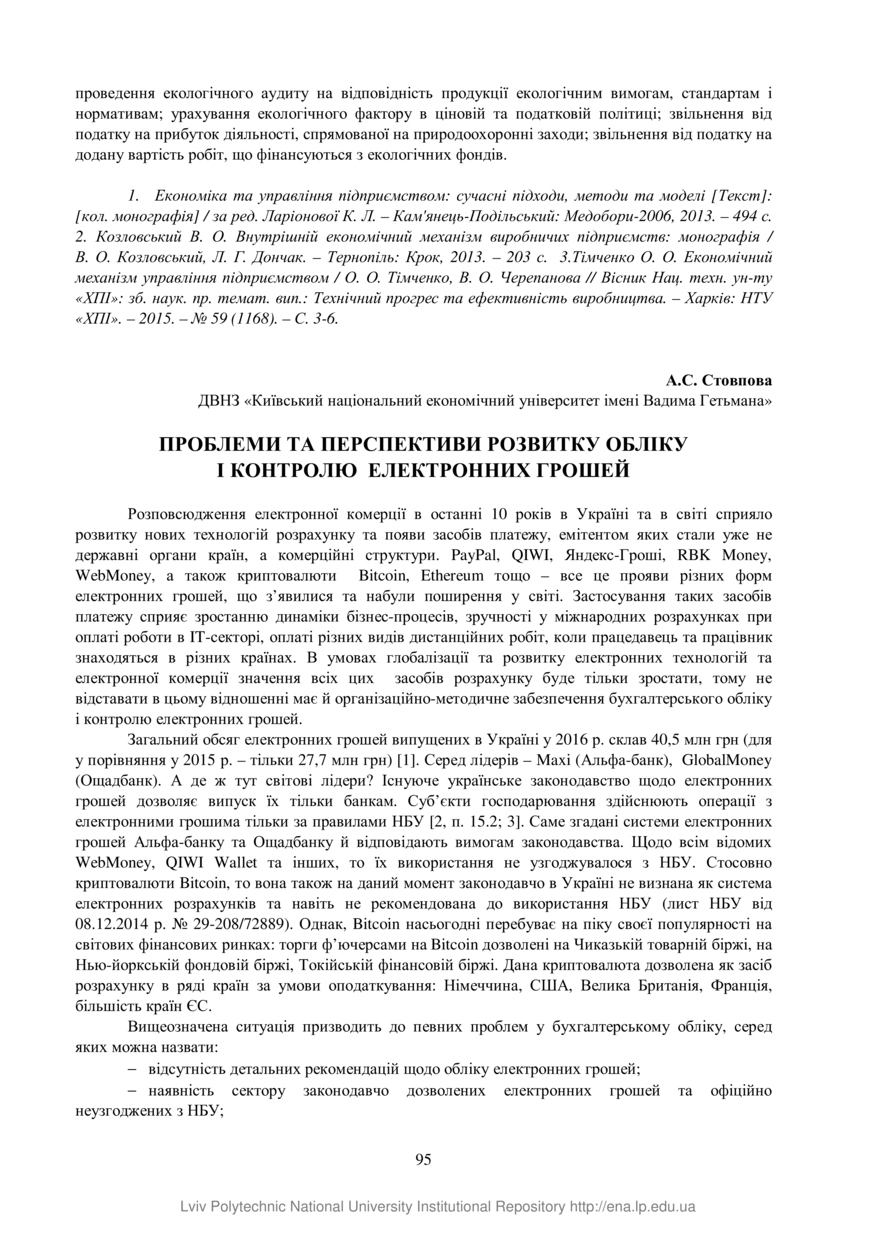 Стовпова А. С. Проблеми та перспективи розвитку обліку і контролю електронних грошей / А. С. Стовпова // Фінансовий ринок: інституції та інструменти, 3–6 червня 2018 року, Львів. — Львів : Видавництво Львівської політехніки, 2018. — С. 95–96.