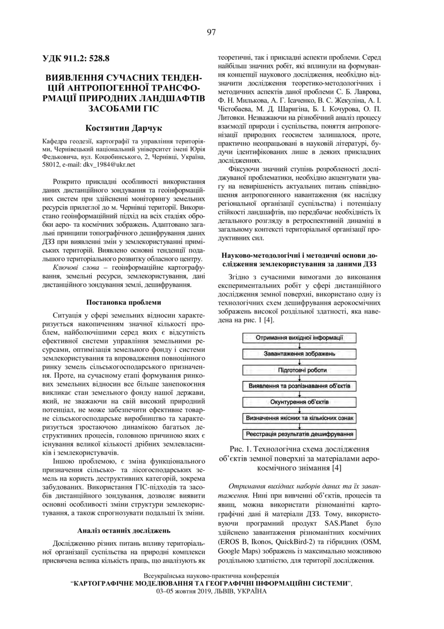 Дарчук К. Виявлення сучасних тенденцій антропогенної трансформації природних ландшафтів засобами ГІС / Костянтин Дарчук // Картографічне моделювання та географічні інформаційні системи : збірник матеріалів всеукраїнської науково-практичної конференції, 3–5 жовтня 2019 року, Львів. — Львів : Видавництво Львівської політехніки, 2019. — С. 97–100.