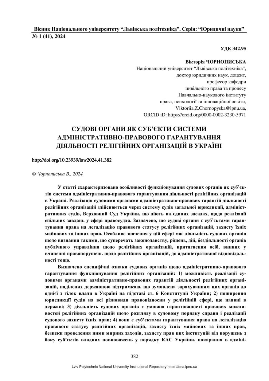 | dc.identifier.citationen | Chornopyska V. Judicial bodies as subjects of the system of administrative and legal guarantee of the activities of religious organizations in Ukraine / Chornopyska Victoria // Bulletin of Lviv Polytechnic National University. Series: Legal Sciences. — Lviv : Lviv Politechnic Publishing House, 2024. — No 1(41). — P. 382–390. | |