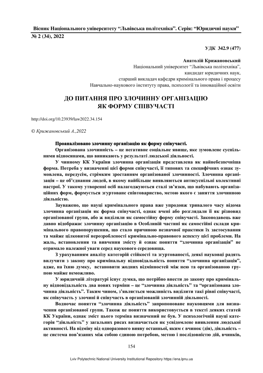 | dc.identifier.citation | Крижановський А. До питання про злочинну організацію як форму співучасті / Анатолій Крижановський // Вісник Національного університету “Львівська політехніка”. Серія: Юридичні науки. — Львів : Видавництво Львівської політехніки, 2022. — № 2(34). — С. 154–159. | |