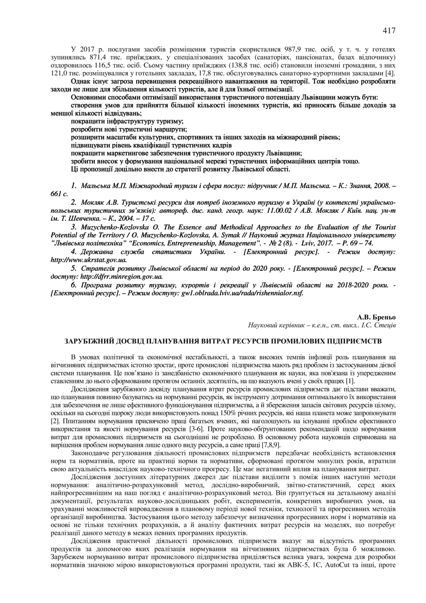 Бреньо А. В. Зарубіжний досвід планування витрат ресурсів промилових підприємств / А. В. Бреньо, І. С. Стеців // 76-та Студентська науково-технічна конференція. Секція "Економіка і менеджмент" : збірник тез доповідей, жовтень – листопад 2018 року. — Львів : Видавництво Львівської політехніки, 2018. — С. 417–418. — (Економіка підприємства та інвестицій).