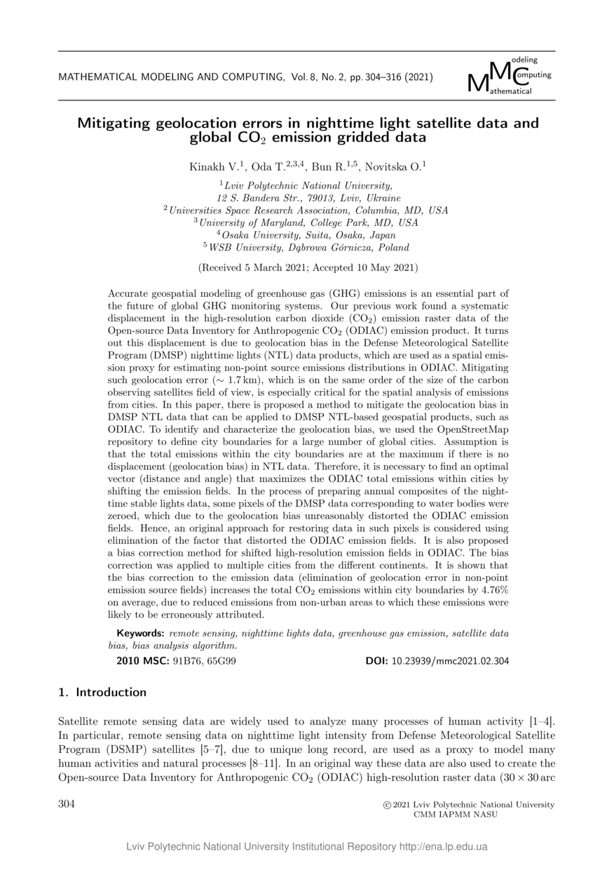 | dc.identifier.citationen | Mitigating geolocation errors in nighttime light satellite data and global CO2 emission gridded data / V. Kinakh, T. Oda, R. Bun, O. Novitska // Mathematical Modeling and Computing. — Lviv : Lviv Politechnic Publishing House, 2021. — Vol 8. — No 2. — P. 304–316. | |