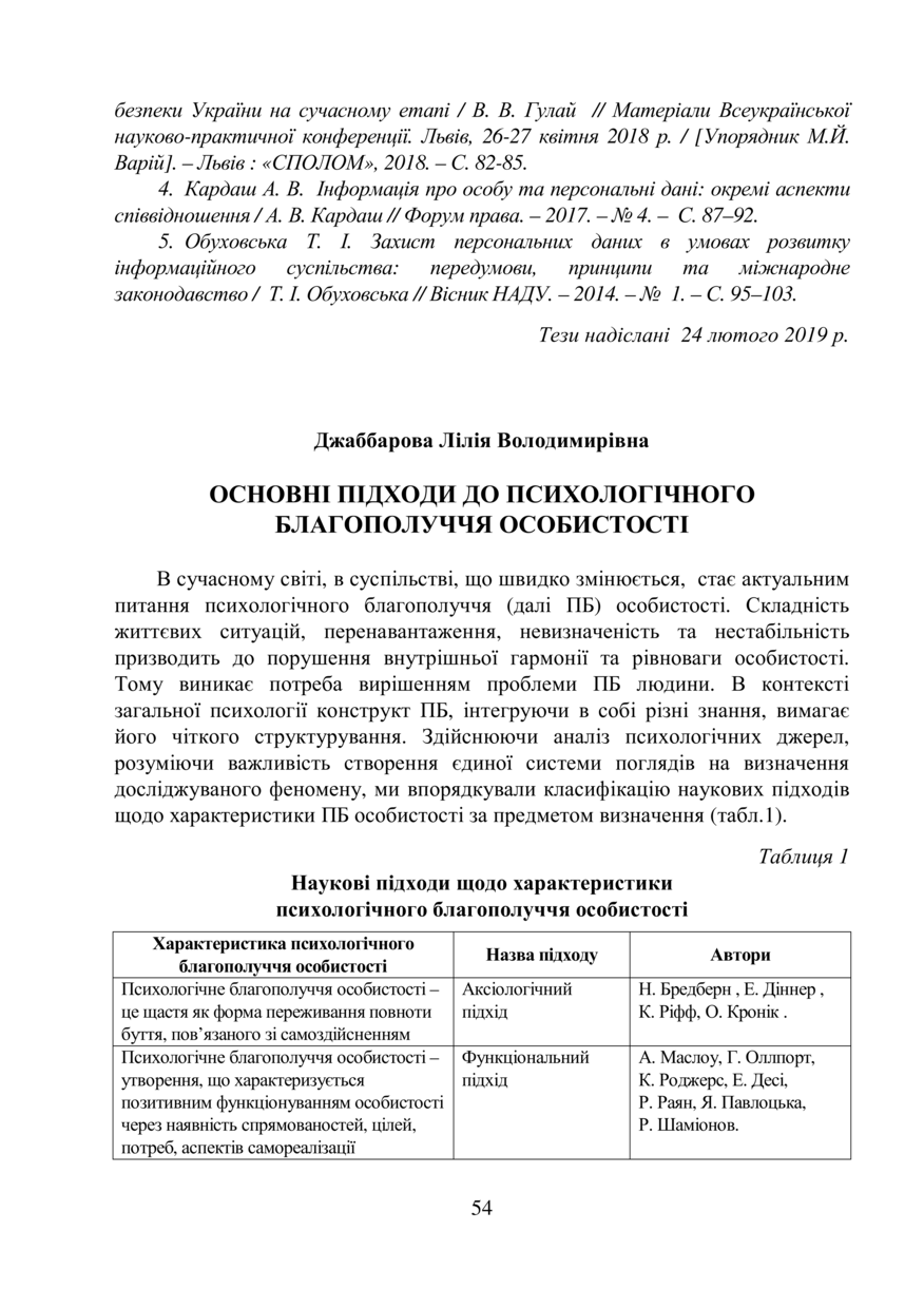 Джаббарова Л. В. Основні підходи до психологічного благополуччя особистості / Лілія Володимирівна Джаббарова // Психологія національної безпеки і благополуччя особистості : тези І Міжнародної науково-практичної конференції, 14–15 березня 2019 року, Львів. — Львів : Видавництво Львівської політехніки, 2019. — С. 54–56.
