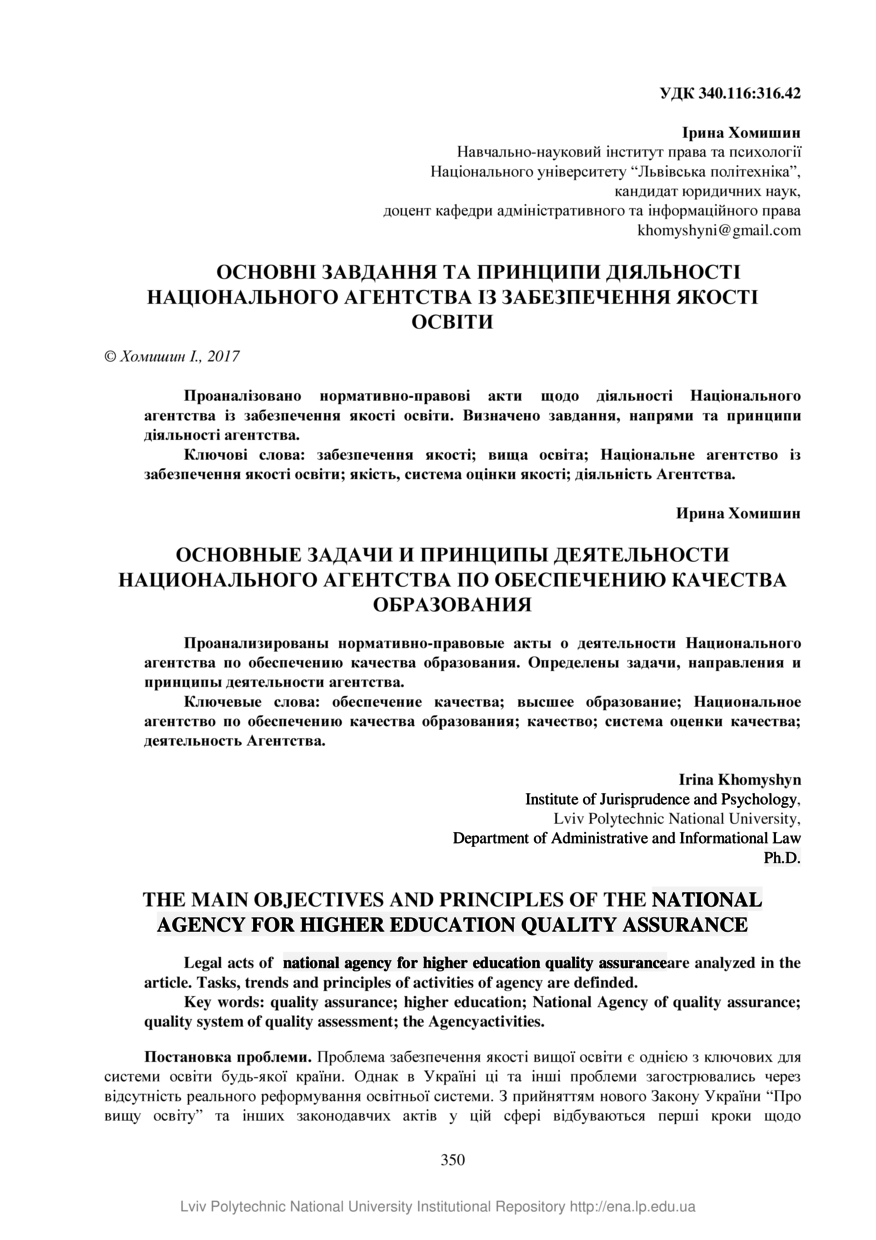 | dc.identifier.citation | Хомишин І. Основні завдання та принципи діяльності національного агентства із забезпечення якості освіти / Ірина Хомишин // Вісник Національного університету «Львівська політехніка». Серія: юридичні науки : збірник наукових праць. — Львів : Видавництво Львівської політехніки, 2017. — № 865. — С. 350–355. | |