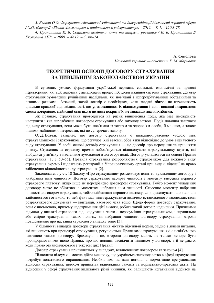 Соколова А. Теоретичні основи договору страхування за цивільним законодавством України / А. Соколова, Х. М. Маркович // 76-та Студентська науково-технічна конференція. Секція права та психології : збірник тез доповідей, 15–29 жовтня 2018 року, Львів. — Львів : Видавництво Львівської політехніки, 2018. — С. 188–189. — (Цивільногого права та процесу).