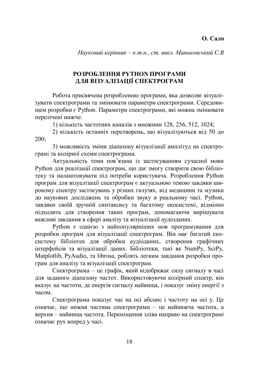 Сало О. Розроблення Python програми для візуалізації спектрограм / О. Сало, С. В. Маньковський // 81-ша Студентська науково-технічна конференція. Секція “Телекомунікації, радіоелектроніка та електронна техніка" : збірник тез доповідей, жовтень–листопад 2023 року. — Львів : Видавництво Львівської політехніки, 2023. — С. 18–19.