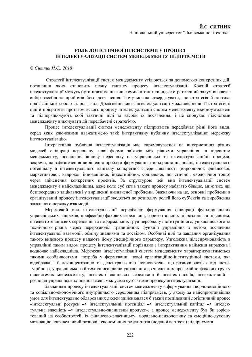 Ситник Й. С. Роль логістичної підсистеми у процесі інтелектуалізації систем менеджменту підприємств / Й. С. Ситник // Маркетинг та логістика в системі менеджменту : тези доповідей XІI Міжнародної науково-практичної конференції, 25–27 жовтня 2018 року, Львів. — Львів : Видавництво Львівської політехніки, 2018. — С. 222–223.