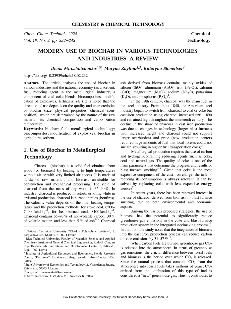 Miroshnichenko D. Modern Use of Biochar in Various Technologies and Industries. A Review / Denis Miroshnichenko, Maryna Zhylina, Kateryna Shmeltser // Chemistry & Chemical Technology. — Lviv : Lviv Politechnic Publishing House, 2024. — Vol 18. — No 2. — P. 232–243.