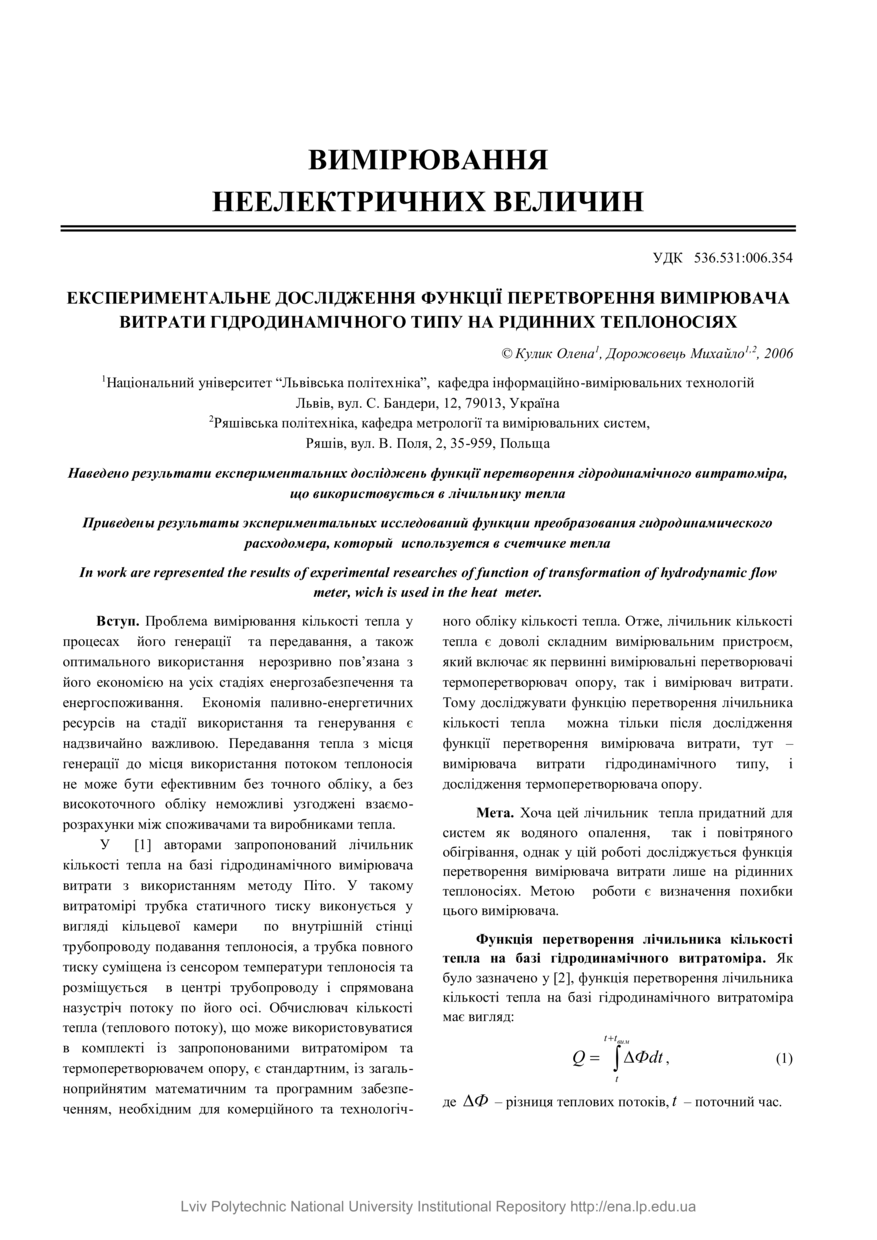 Кулик О. Експериментальне дослідження функції перетворення вимірювача витрати гідродинамічного типу на рідинних теплоносіях / Олена Кулик, Михайло Дорожовець // Вимірювальна техніка та метрологія. — Львів : Видавництво Національного університету “Львівська політехніка”, 2006. — № 66. — С. 80–84.