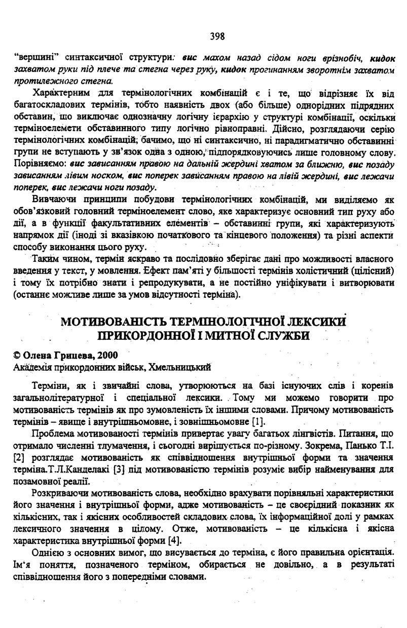 Грицева О. Мотивованість термінологічної лексики прикордонної і митної служби / О. Грицева // Вісник Державного університету “Львівська політехніка”. — Львів : Видавництво Державного університету “Львівська політехніка”, 2000. — № 402 : Проблеми української термінології. — С. 398–401. — (Термінологія гуманітарних знань).