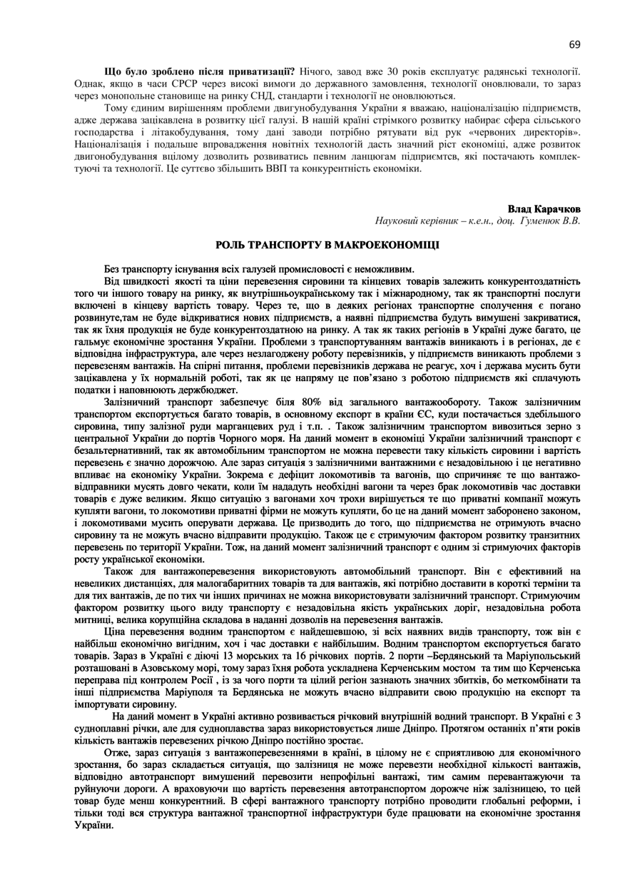Карачков В. Роль транспорту в макроекономіці / Влад Карачков, В. В. Гуменюк // 77-ма Студентська науково-технічна конференція. Секція "Публічне управління та адміністрування" : збірник тез доповідей, 7 листопада 2019 року, Львів. — Львів : Видавництво Львівської політехніки, 2019. — С. 69. — (Економічна теорія та історія розвитку економіки).
