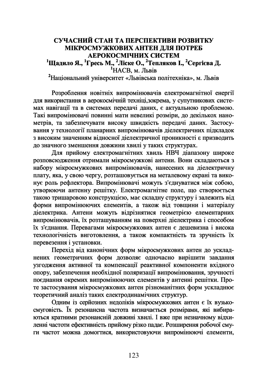 Сучасний стан та перспективи розвитку мікросмужкових антен для потреб аерокосмічних систем / Я. Щадило, М. Гресь, О. Ліске, І. Тепляков, Д. Сергієва // GEOFORUM’2019 : тези доповідей 24 Міжнародної науково-технічної конференції, 10–12 квітня 2019 року, Львів. — Львів : Видавництво Львівської політехніки, 2019. — С. 123–124.