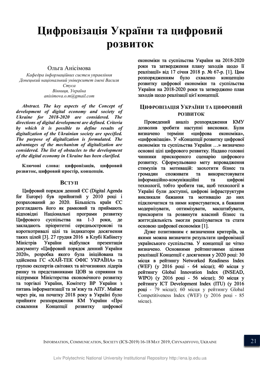 Анісімова О. Цифровізація України та цифровий розвиток / Ольга Анісімова // Інформація, комунікація, суспільство 2019 : матеріали 8-ої Міжнародної наукової конференції ІКС-2019, 16-18 травня 2019 року, Чинадієво. — Львів : Видавництво Львівської політехніки, 2019. — С. 21–22. — (Інформаційні та комунікаційні технології в Internet та World Wide Web).