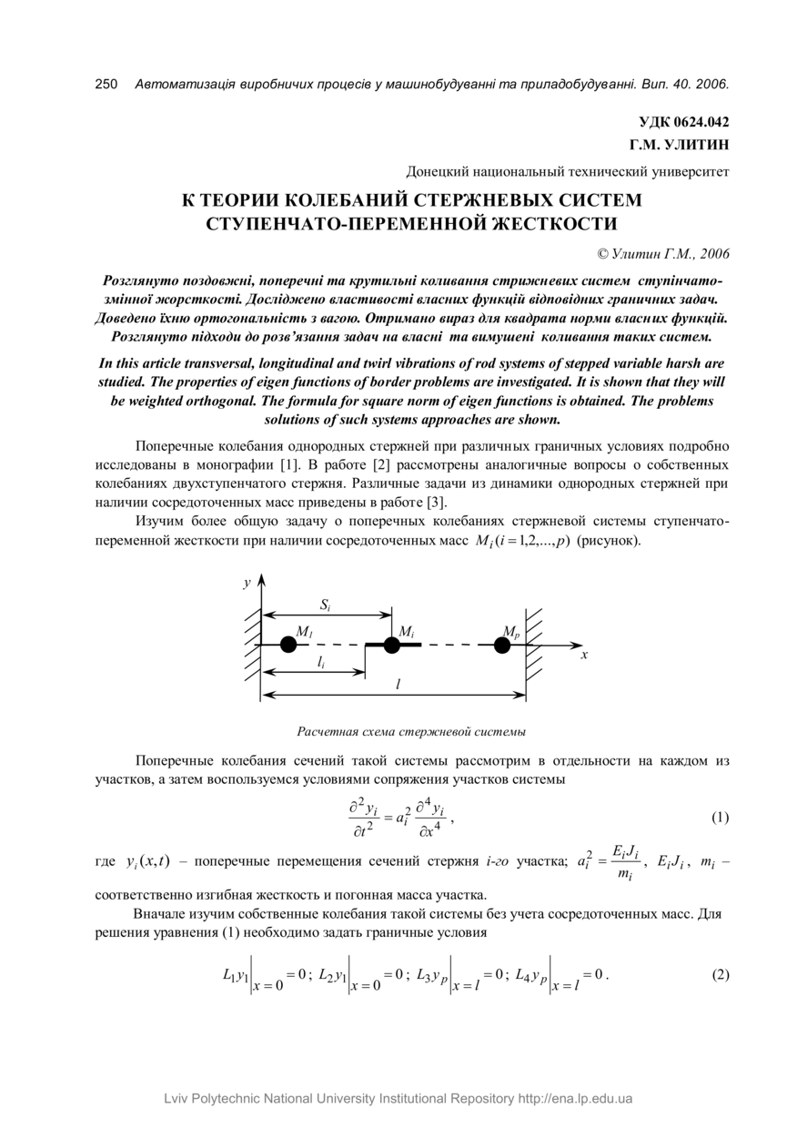 Улитин Г. М. К теории колебаний стержневых систем ступенчато-переменной жесткости / Г. М. Улитин // Автоматизація виробничих процесів у машинобудуванні та приладобудуванні : український міжвідомчий науково-технічний збірник. — Львів : Видавництво Національного університету “Львівська політехніка”, 2006. — № 40. — С. 251–255.