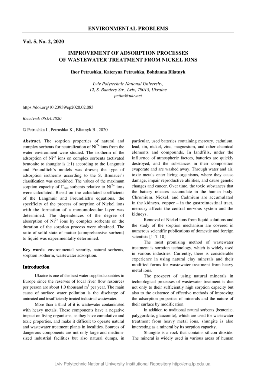 | dc.identifier.citationen | Petrushka I. Improvement of adsorption processes of wastewater treatment from nickel ions / Ihor Petrushka, Kateryna Petrushka, Bohdanna Bliatnyk // Environmental Problems. — Lviv : Lviv Politechnic Publishing House, 2020. — Vol 5. — No 2. — P. 83–87. | |
