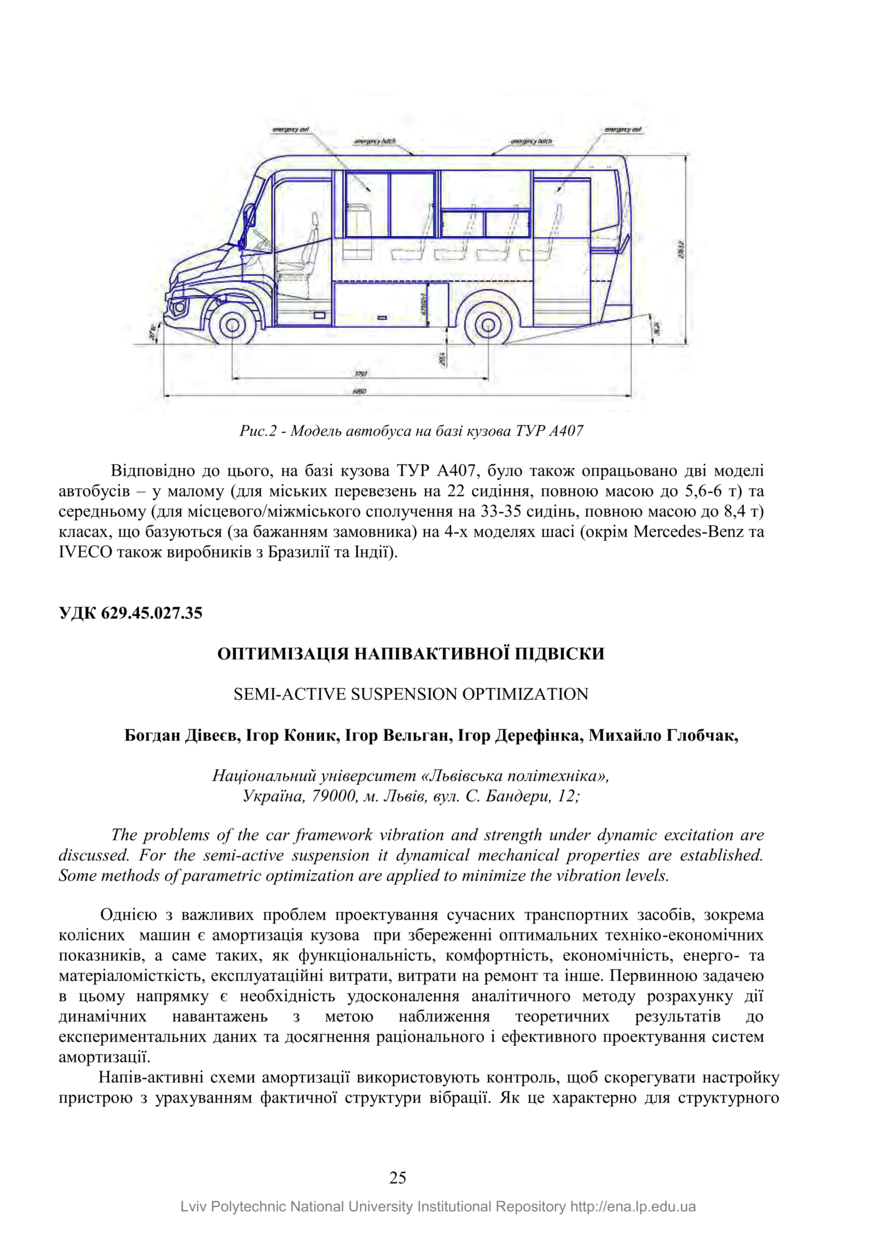 Оптимізація напівактивної підвіски / Богдан Дівеєв, Ігор Коник, Ігор Вельган, Ігор Дерефінка, Михайло Глобчак // Автобусобудування та пасажирські перевезення в Україні : тези доповідей III-ої Всеукраїнської науково-практичної конференції, Львів, 22-23 лютого 2018 року. — Львів : Видавництво Львівської політехніки, 2018. — С. 25–27. — (Автобусо- та автомобілебудування).