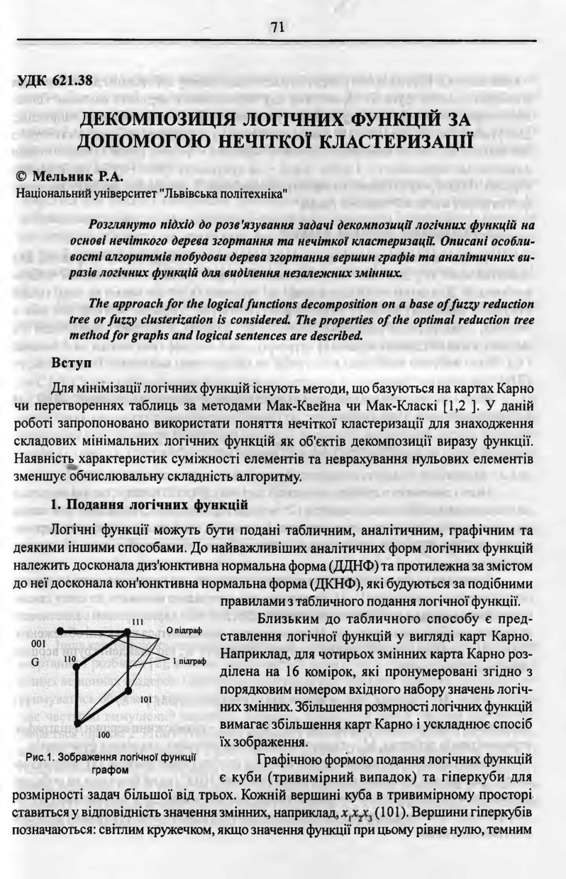 Мельник Р. А. Декомпозиція логічних функцій за допомогою нечіткої кластеризації / Р. А. Мельник // Вісник Національного університету “Львівська політехніка”. — Львів : Видавництво Національного університету “Львівська політехніка”, 2002. — № 450 : Комп'ютерна інженерія та інформаційні технології. — С. 71–76.