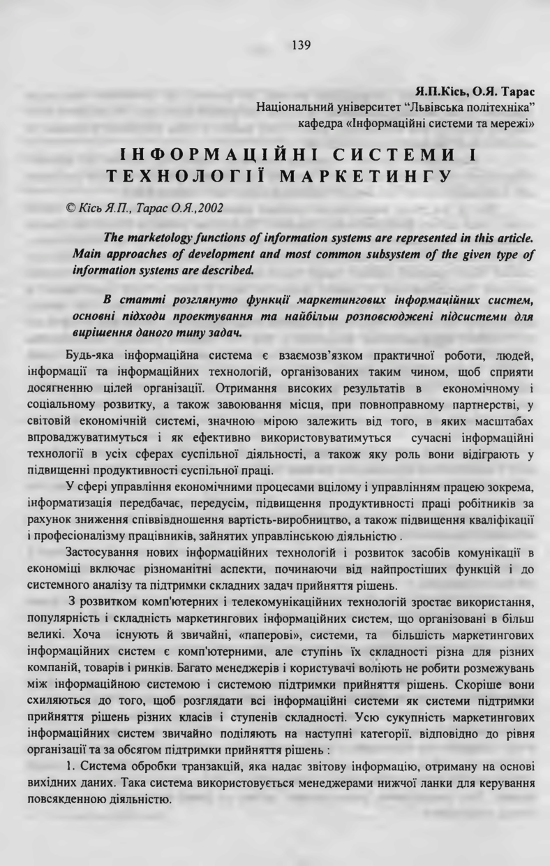 Кісь Я. П. Інформаційні системи і технології маркетингу / Я. П. Кісь, О. Я. Тарас // Вісник Національного університету “Львівська політехніка”. — Львів : Видавництво Національного університету “Львівська політехніка”, 2002. — № 464 : Інформаційні системи та мережі. — С. 139–146.
