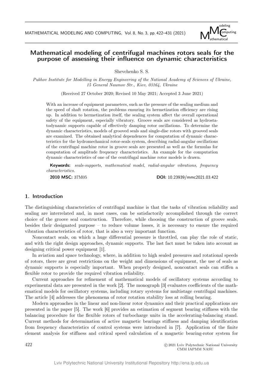 | dc.relation.referencesen | [14] Shevchenko S. S., Shevchenko M. S. Mathematical modeling of centrifugal machines rotors seals as dynamic systems. Bulletin of the National Technical University "Kharkov Polytechnic Institute". Series "Informatics and Modeling". 4, 85–102 (2020). | |