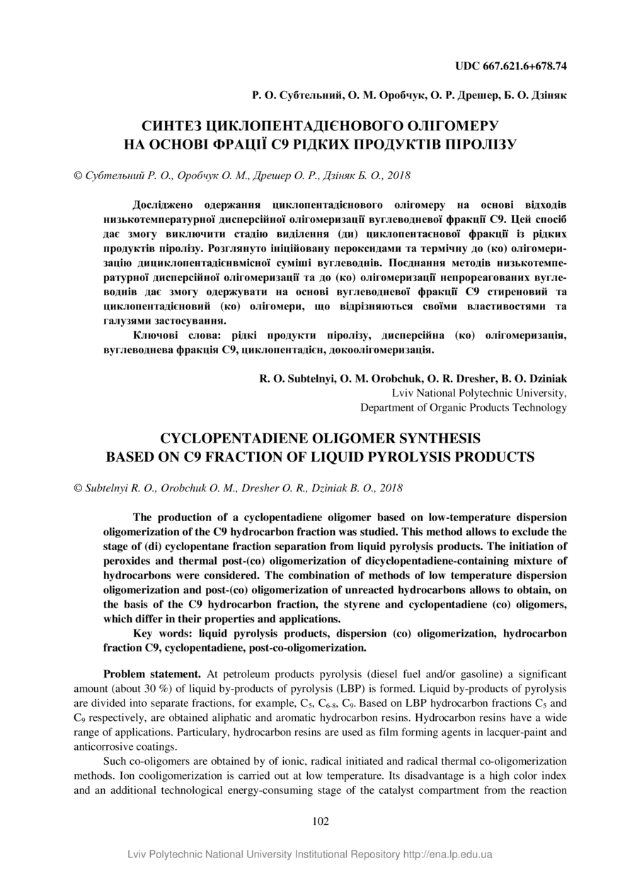 | dc.identifier.citation | Cyclopentadiene oligomer synthesis based on c9 fraction of liquid pyrolysis products / R. O. Subtelnyi, O. M. Orobchuk, O. R. Dresher, B. O. Dziniak // Вісник національного університету “Львівська політехніка”. Серія: Хімія, технологія речовин та їх застосування. — Львів : Видавництво Львівської політехніки, 2018. — № 886. — С. 102–106. — (Технологія органічних речовин, нафти та газу). | |