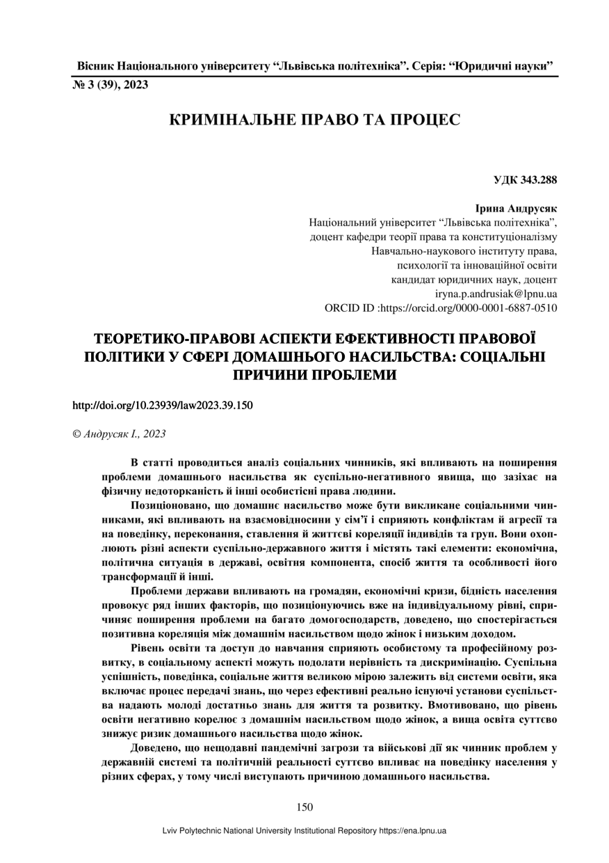 Андрусяк І. Теоретико-правові аспекти ефективності правової політики у сфері домашнього насильства: соціальні причини проблеми / Ірина Андрусяк // Вісник Національного університету “Львівська політехніка”. Серія: “Юридичні науки”. — Львів : Видавництво Львівської політехніки, 2023. — № 3 (39). — С. 150–156.