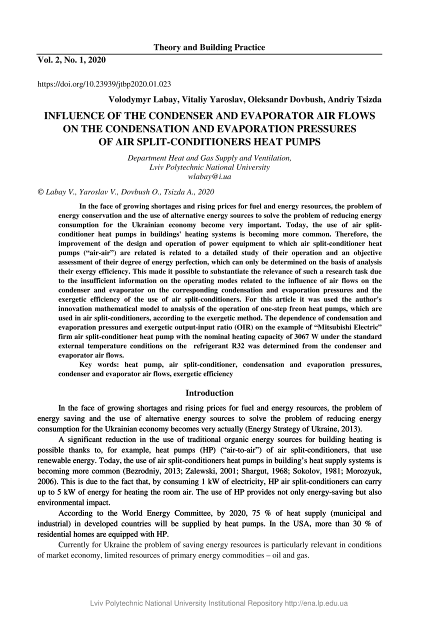 | dc.identifier.citationen | Influence of the condenser and evaporator air flows on the condensation and evaporation pressures of air split-conditioners heat pumps / Volodymyr Labay, Vitaliy Yaroslav, Oleksandr Dovbush, Andriy Tsizda // Theory and Building Practice. — Lviv : Lviv Politechnic Publishing House, 2020. — Vol 2. — No 1. — P. 23–29. | |
