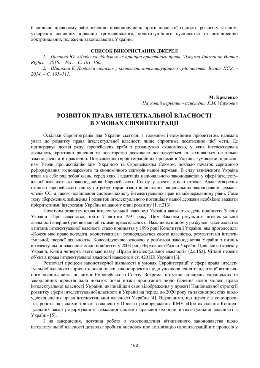 Криленко М. Розвиток права інтелектуальної власності в умовах євроінтеграції / М. Криленко, Х. М. Маркович // 76-та Студентська науково-технічна конференція. Секція права та психології : збірник тез доповідей, 15–29 жовтня 2018 року, Львів. — Львів : Видавництво Львівської політехніки, 2018. — С. 162–163. — (Цивільногого права та процесу).