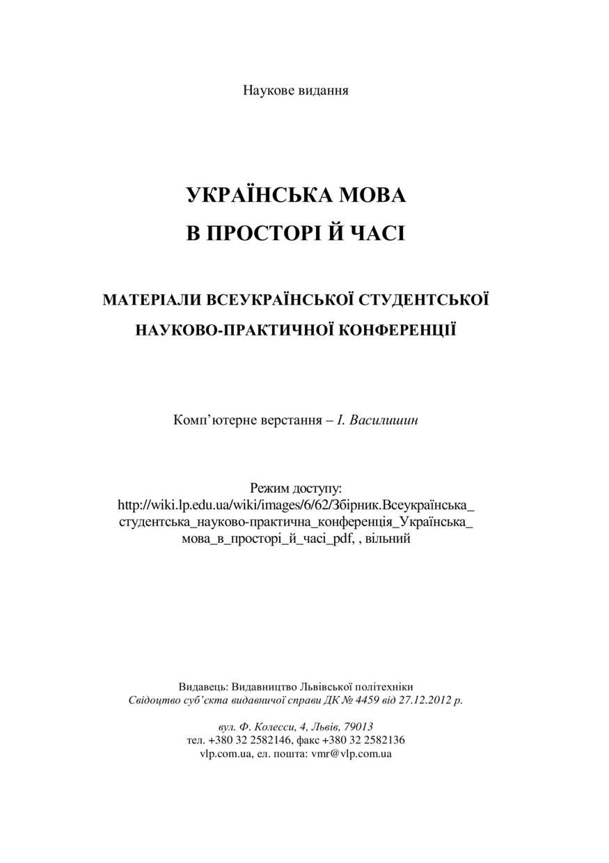 Видавнича сторінка // Українська мова в просторі й часі : матеріали Всеукраїнської студентської науково-практичної конференції, 17–19 квітня 2019 року, Львів. — Львів : Видавництво Львівської політехніки, 2019. — С. 168–169. — (Граматичні особливості сучасної української мови).