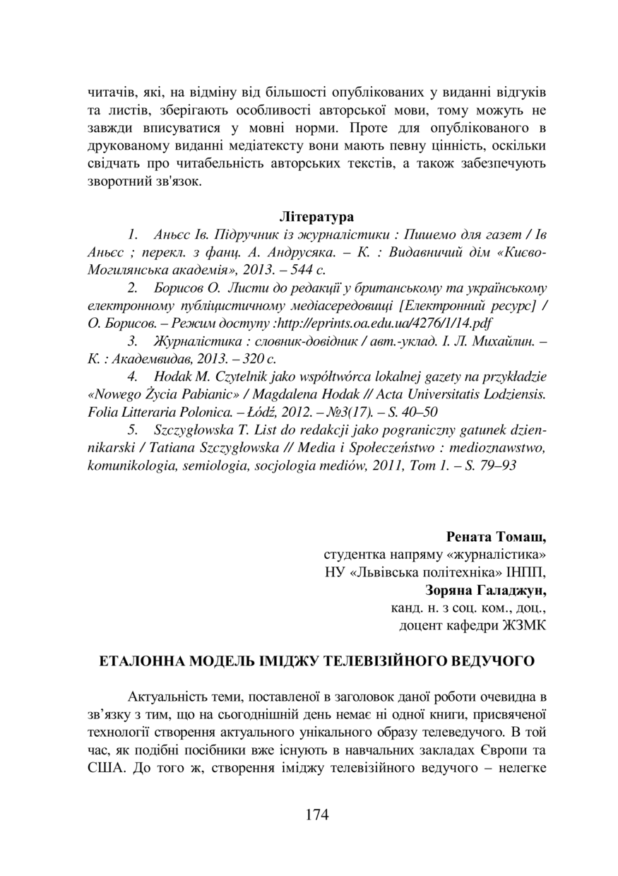 Томаш Р. Еталонна модель іміджу телевізійного ведучого / Рената Томаш, Зоряна Галаджун // Проблеми журналістики: вчора, сьогодні, завтра :збірник матеріалів I Міжнародної наукової онлайн-конференції студентів та молодих дослідників, 4 квітня 2019 року, Львів. — Lviv : Видавництво Львівської політехніки, 2019. — P. 174–177.