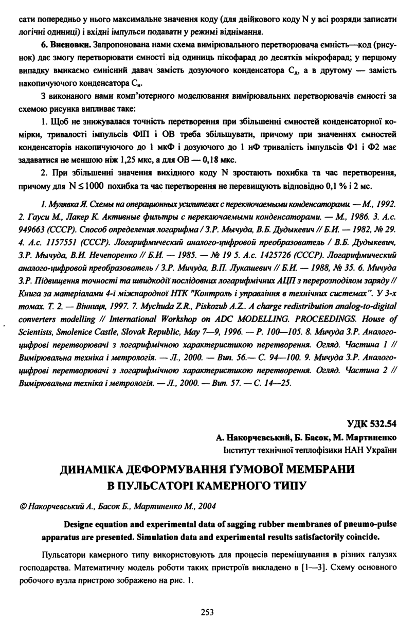 Накорчевський А. Динаміка деформування гумової мембрани в пульсаторі камерного типу / А. Накорчевський, Б. Басок, М. Мартиненко // Вісник Національного університету “Львівська політехніка”. — Львів : Видавництво Національного університету “Львівська політехніка”, 2004. — № 506 : Теплоенергетика. Інженерія довкілля. Автоматизація. — С. 253–257.