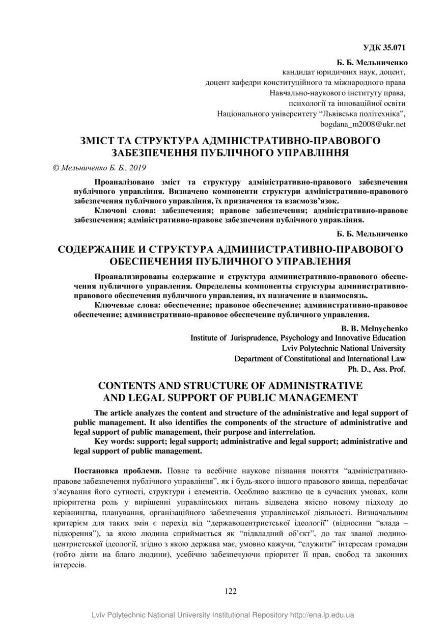 Мельниченко Б. Б. Зміст та структура адміністративно-правового забезпечення публічного управління / Б. Б. Мельниченко // Вісник Національного університету “Львівська політехніка”. Серія: Юридичні науки. — Львів : Видавництво Львівської політехніки, 2019. — № 24. — С. 122–133.