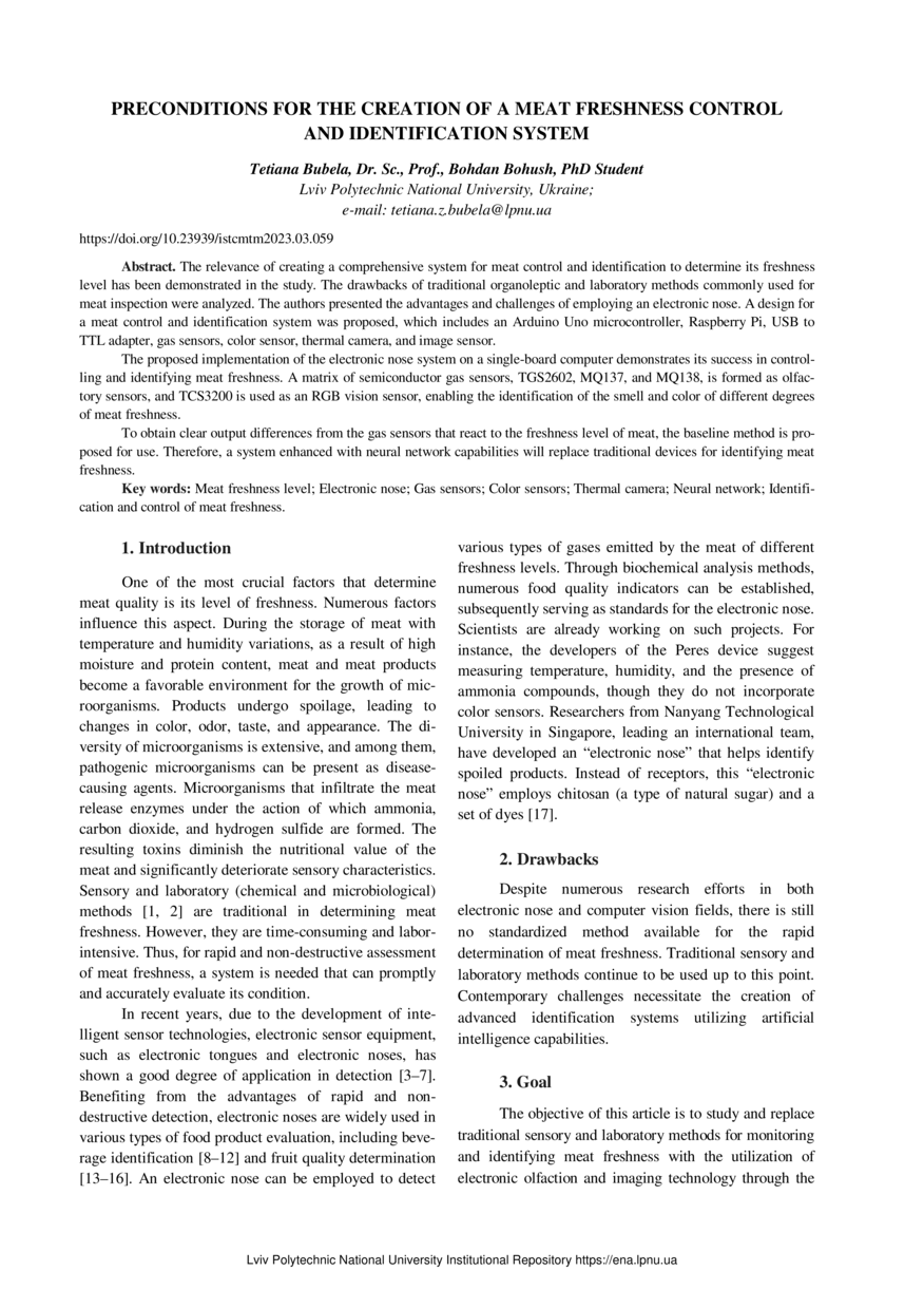 Bubela T. Preconditions for the creation of a meat freshness control and identification system / Tetiana Bubela, Bohdan Bohush // Measuring Equipment and Metrology. — Lviv : Lviv Politechnic Publishing House, 2023. — Vol 84. — No 3. — P. 59–65.