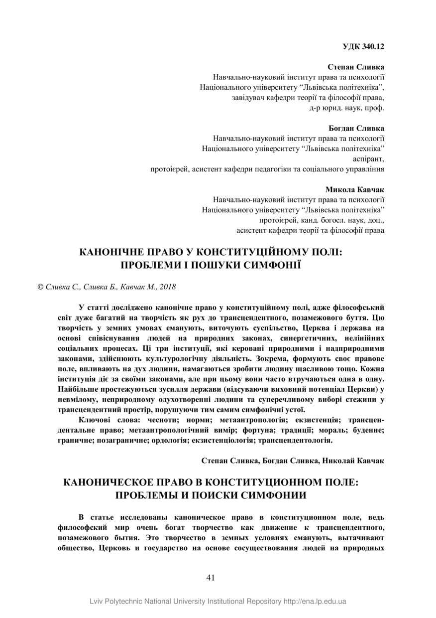 Сливка С. Канонічне право у конституційному полі: проблеми і пошуки симфонії / Степан Сливка, Богдан Сливка, Микола Кавчак // Вісник Національного університету “Львівська політехніка”. Серія: Юридичні науки. — Львів : Видавництво Львівської політехніки, 2018. — № 906 (20). — С. 41–47.