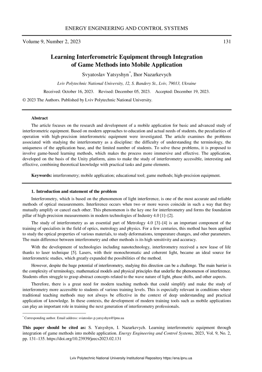Yatsyshyn S. Learning Interferometric Equipment through Integration of Game Methods into Mobile Application / Svyatoslav Yatsyshyn, Ihor Nazarkevych // Energy Engineering and Control Systems. — Lviv : Lviv Politechnic Publishing House, 2023. — Vol 9. — No 2. — P. 131–135.