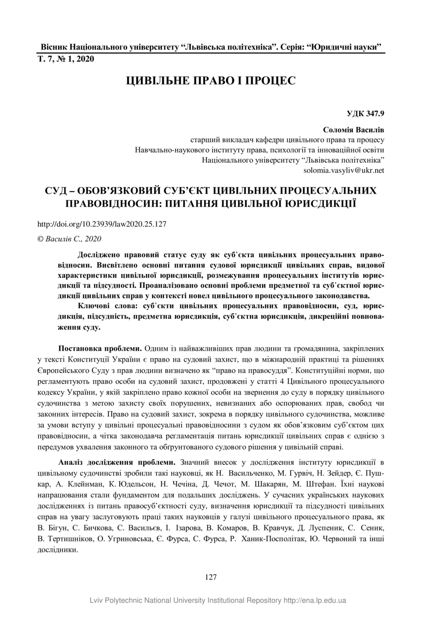 Василів С. Суд – обов’язковий суб’єкт цивільних процесуальних правовідносин: питання цивільної юрисдикції / Соломія Василів // Вісник Національного університету “Львівська політехніка”. Серія: Юридичні науки. — Львів : Видавництво Львівської політехніки, 2020. — Том 7. — № 1. — С. 127–133.