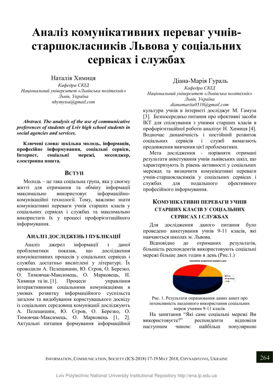 Химиця Н. Аналіз комунікативних переваг учнів-старшокласників Львова у соціальних сервісах і службах / Наталія Химиця, Діана-Марія Гураль // Інформація, комунікація, суспільство : матеріали 7-ї Міжнародної наукової конференції, 17–19 травня 2018 року, Чинадієво. — Львів : Видавництво Львівської політехніки, 2018. — С. 264–265. — (Соціальні комунікації).