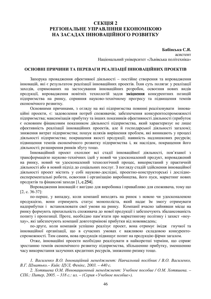 Бабінська С. Я. Основні причини та переваги реалізації інноваційних проектів / С. Я. Бабінська // Управління економічними процесами на макро- і мікрорівні: проблеми та перспективи вирішення : матеріали ІІІ Міжнародної науково-практичної інтернет-конференції молодих учених, 24–25 квітня 2018 р., Львів. — Львів : Видавництво Львівської політехніки, 2018. — С. 46. — (Регіональне управління економікою на засадах інноваційного розвитку).