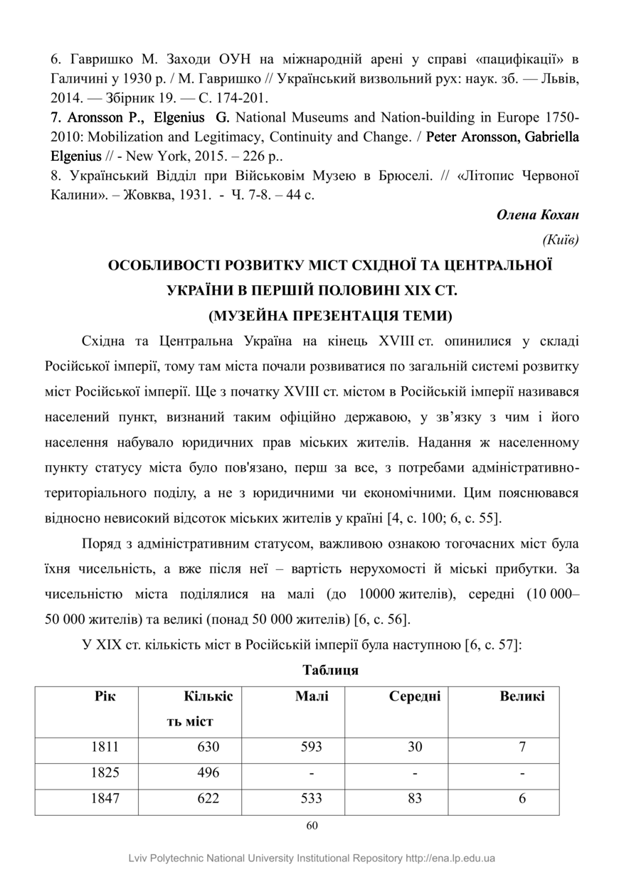 Кохан О. Особливості розвитку міст Східної та Центральної України в першій половині ХІХ ст. (музейна презентація теми) / Олена Кохан // Історико-культурна спадщина: європейський вимір : тези Всеукраїнської науково-практичної конференції, 1 червня, 2018 року, Львів. — Львів : Інтерпрінт, 2018. — С. 60–63.