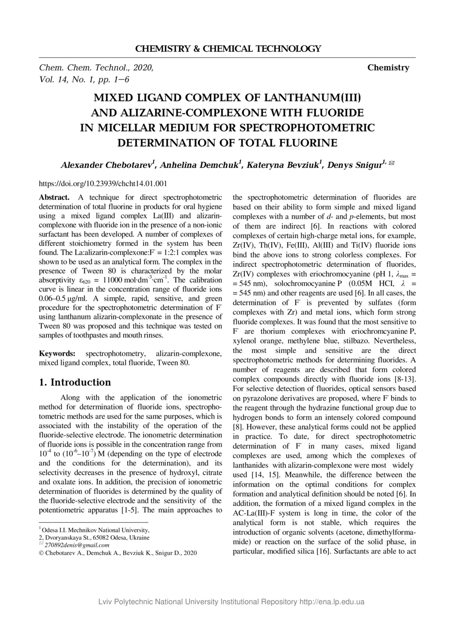 | dc.identifier.citationen | Mixed Ligand Complex of Lanthanum(III) and Alizarine-Complexone with Fluoride in Micellar Medium for Spectrophotometric Determination of Total Fluorine / Alexander Chebotarev, Anhelina Demchuk, Kateryna Bevziuk, Denys Snigur // Chemistry & Chemical Technology. — Lviv : Lviv Politechnic Publishing House, 2020. — Vol 14. — No 1. — P. 1–6. | |