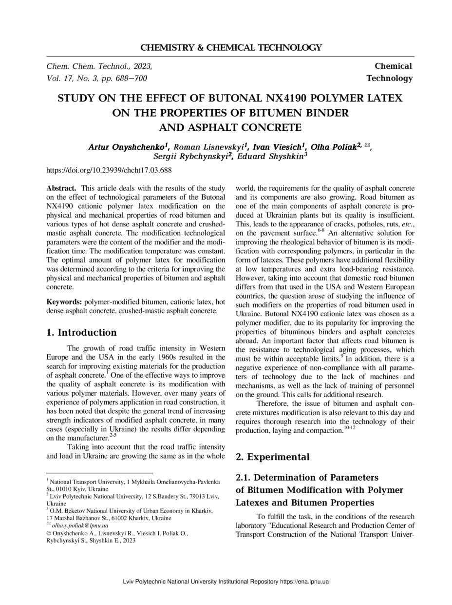 | dc.identifier.citationen | Study on the Effect of Butonal NX4190 Polymer Latex on the Properties of Bitumen Binder and Asphalt Concrete / Artur Onyshchenko, Roman Lisnevskyi, Ivan Viesich, Olha Poliak, Sergii Rybchynskyi, Eduard Shyshkin // Chemistry & Chemical Technology. — Lviv : Lviv Politechnic Publishing House, 2023. — Vol 17. — No 3. — P. 688–700. | |