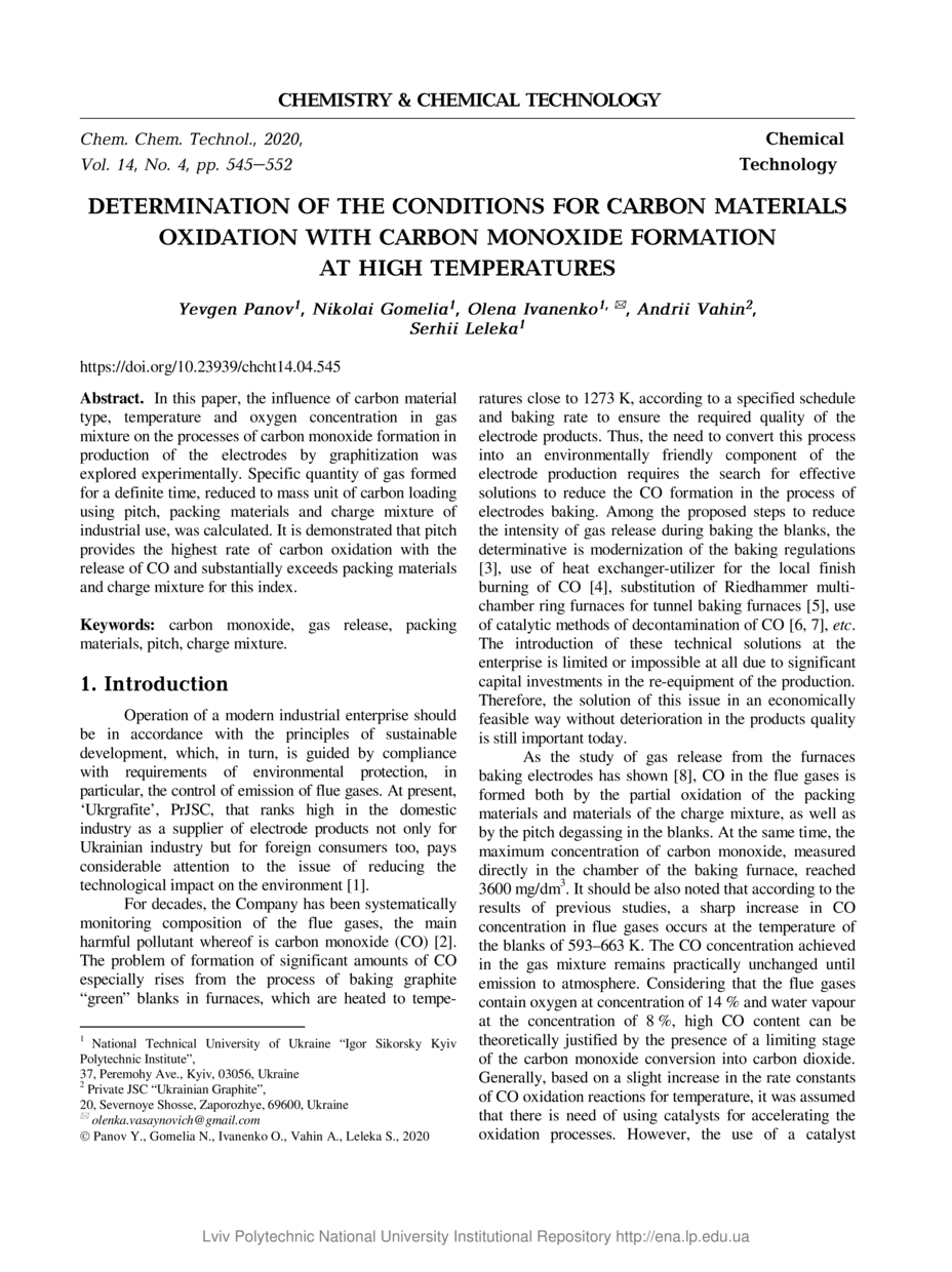 Determination of the Conditions for Carbon Materials Oxidation with Carbon Monoxide Formation at High Temperatures / Yevgen Panov, Nikolai Gomelia, Olena Ivanenko, Andrii Vahin, Serhii Leleka // Chemistry & Chemical Technology. — Lviv : Lviv Politechnic Publishing House, 2020. — Vol 14. — No 4. — P. 545–552.