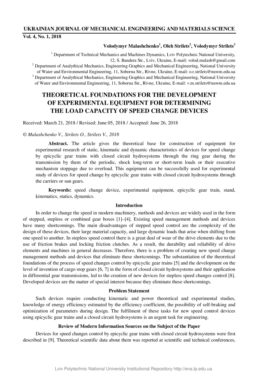 Malashchenko V. Theoretical foundations for the development of experimental equipment for determining the load capacity of speed change devices / Volodymyr Malashchenko, Oleh Strilets, Volodymyr Strilets // Ukrainian Journal of Mechanical Engineering and Materials Science. — Lviv : Lviv Politechnic Publishing House, 2018. — Vol 4. — No 1. — P. 125–130.