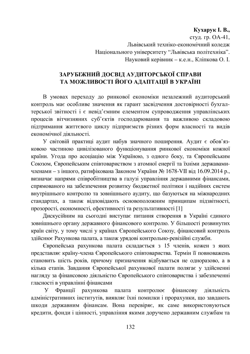 Кухарук І. В. Зарубіжний досвід аудиторської справи та можливості його адаптації в Україні / І. В. Кухарук, О. І. Кліпкова // Облік, аналіз і контроль в системі управління суб’єктами економіки : тези доповідей ІV Міжнародної студентської наукової конференції, 18–19 жовтня 2018 року, Львів. — Львів : Видавництво Львівської політехніки, 2018. — С. 132–134. — (Проблеми та перспективи розвитку аудиторської діяльності в Україні).