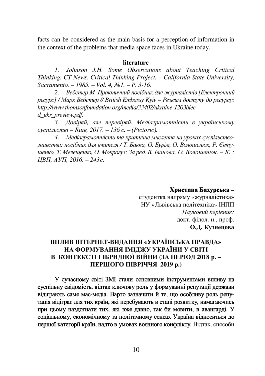 Бахурська Х. Вплив інтернет-видання «Українська правда» на формування іміджу України у світі в контексті гібридної війни (за період 2018 р. – першого півріччя 2019 р.) / Христина Бахурська, О. Д. Кузнецова // Проблеми журналістики: вчора, сьогодні, завтра :збірник матеріалів I Міжнародної наукової онлайн-конференції студентів та молодих дослідників, 4 квітня 2019 року, Львів. — Lviv : Видавництво Львівської політехніки, 2019. — P. 10–13.