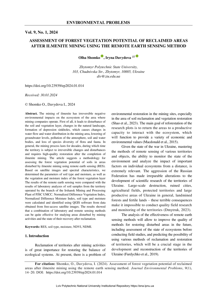 Shomko O. Assessment of forest vegetation potential of reclaimed areas after ilmenite mining using the remote earth sensing method / Olha Shomko, Iryna Davydova // Environmental Problems. — Lviv : Lviv Politechnic Publishing House, 2024. — Vol 9. — No 1. — P. 14–20.