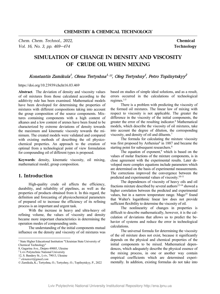 | dc.identifier.citation | Simulation of Change in Density and Viscosity of Crude Oil When Mixing / Konstantin Zamikula, Olena Tertyshna, Oleg Tertyshny, Petro Topilnytskyy // Chemistry & Chemical Technology. — Lviv : Lviv Politechnic Publishing House, 2022. — Vol 16. — No 3. — P. 469–474. | |