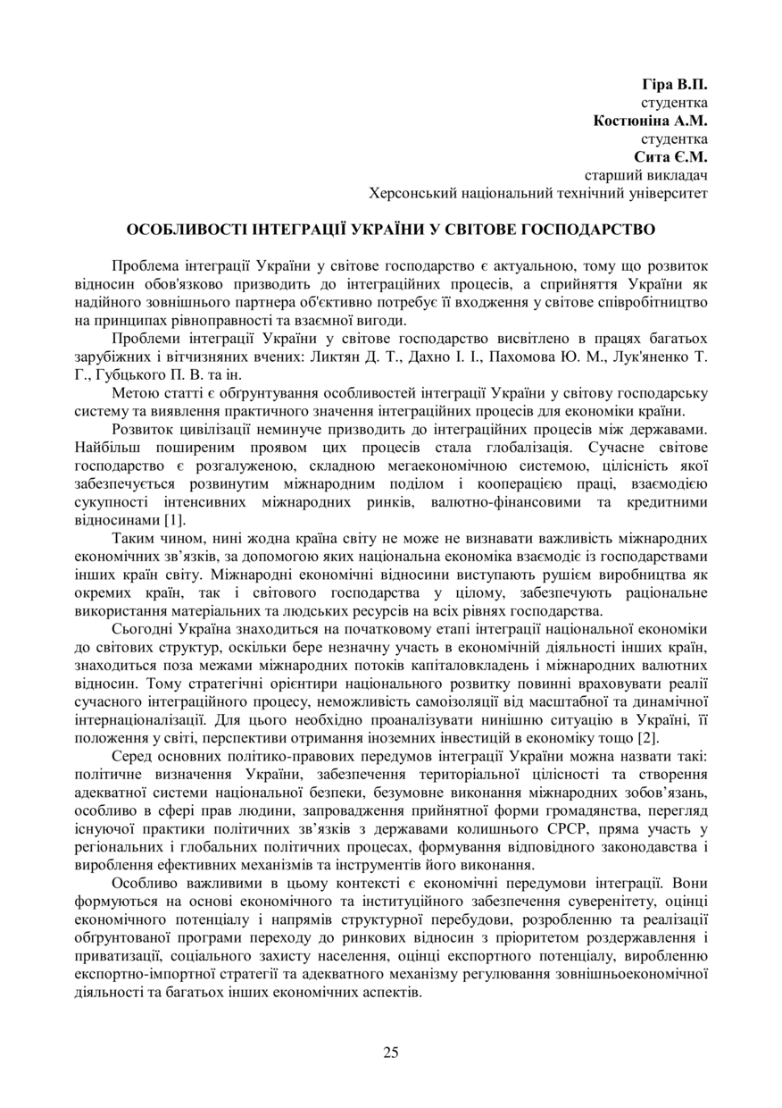 Гіра В. П. Особливості інтеграції України у світове господарство / В. П. Гіра, А. М. Костюніна, Є. М. Сита // Економічний розвиток держави, регіонів і підприємств: проблеми та перспективи : матеріали ІІ Міжнародної науково-практичної конференції молодих учених, 18–19 травня 2017 року, Львів. — Львів : Видавництво Львівської політехніки, 2017. — С. 25–27. — (Проблеми і перспективи економічного розвитку України в умовах євроінтеграції).