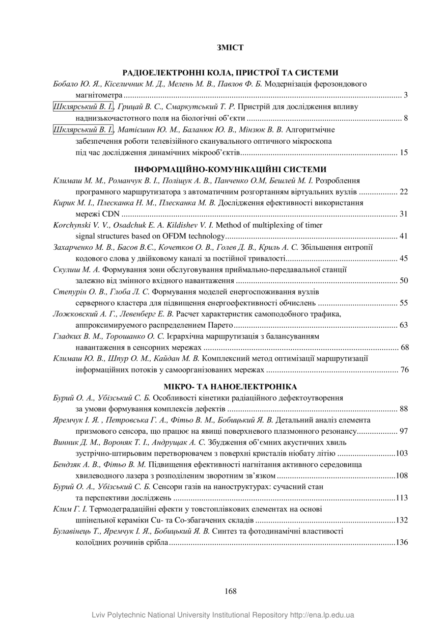 Зміст до Вісника Національного університету «Львівська політехніка». Серія: Радіоелектроніка та телекомунікації // Вісник Національного університету «Львівська політехніка». Серія: Радіоелектроніка та телекомунікації. — Львів : Видавництво Львівської політехніки, 2017. — № 885. — С. 168–172.